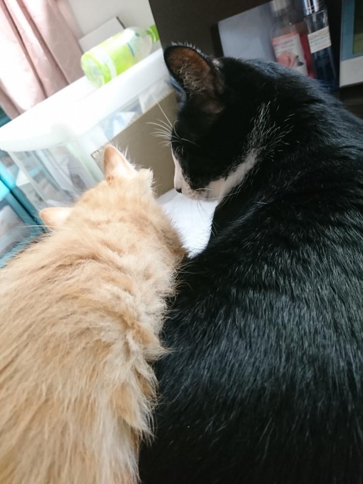 どちらかというと、どっしり構えている先住猫に子猫のが寄り添いに行く感じ。
