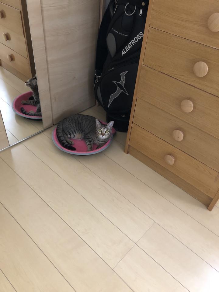 この写真は息子が撮ったもので、私が開けるといつも、物凄い、勢いで走って脱走します。私の足音が聞こえると、このように構えているみたいです(笑)