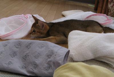 用意しておいたおもちゃで散々遊び、取り込んでいた洗濯物にも