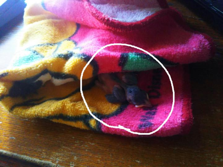 もしも保護したなら、少しの砂糖をぬるま湯に溶かすか、スポーツドリンク(ポカリ等)を、シリンジに入れて呑ませて、その後巣を探して返す、と書いてありました。