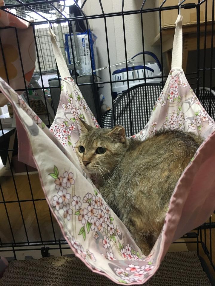 こてぷさんに作っていただいたニャンモックにしっぽちゃんに座っていただきました。