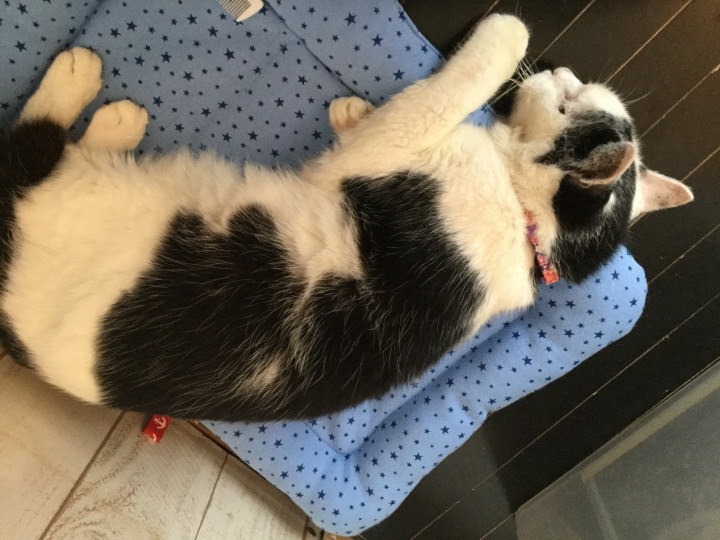 夜にコンビニに行く途中で家の前を通ると芝生の上で気持ち良さそうに眠っていました。やっぱりここが、もうもうちゃんの居場所だもんね。