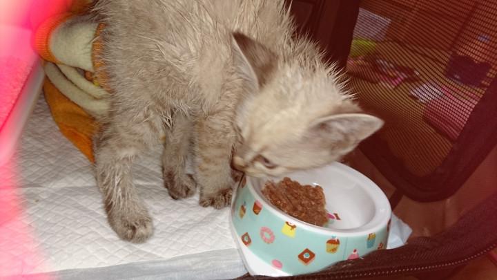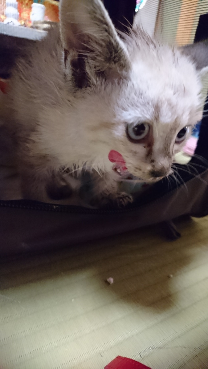 ノミ、ダニがひどく衰弱してるし、右後ろ足がおかしい…。とりあえず、今日はフロントライン。1週間程度したらレントゲン。でも、診た感じ事故後に見えるし骨盤骨折なんかがあるかもしれない。レントゲンで骨折がわかっても、小さすぎて手術は出来ないだろう。おそらく、元気になったとしても障害は残る。とのお言葉。