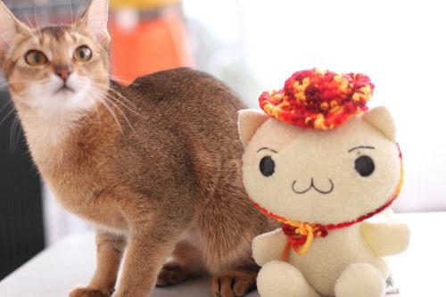少し毛糸が余ったのでみ~ちょに帽子でも…と即興で編んでみました。