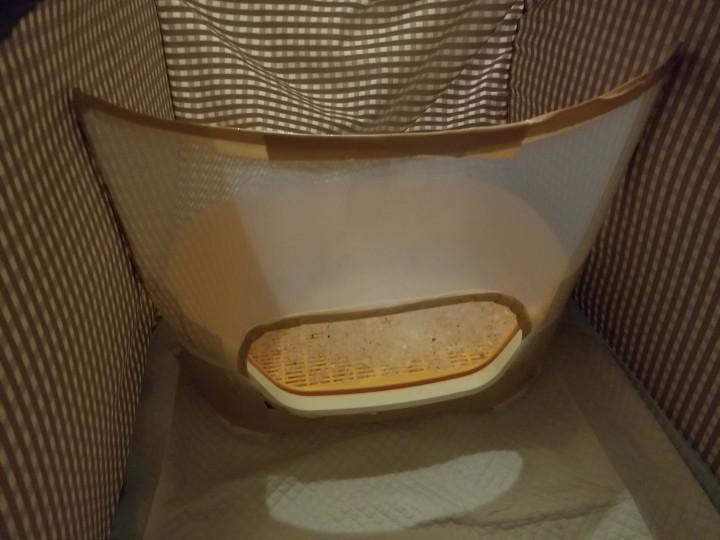 そしてケージ自体に穴開けてS字フック引っ掻け&底に耐震シート的なの貼ってトイレ固定を試みる…まだトイレ使ってないようなので効果のほどは不明!