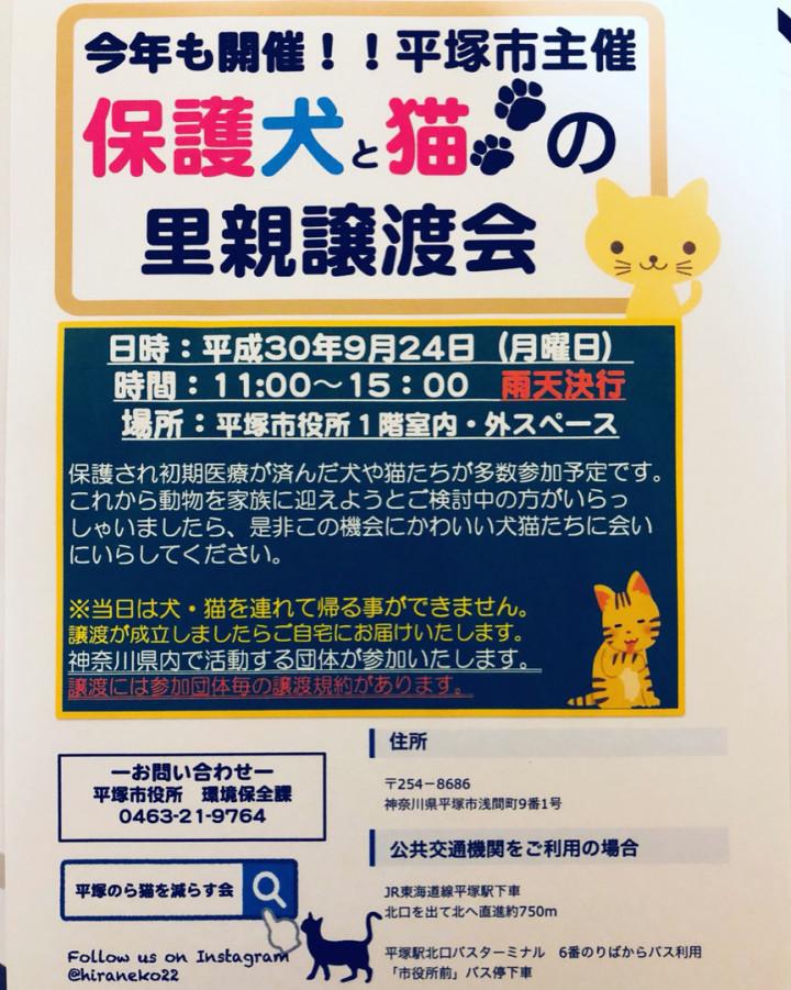 今年も開催される運びとなった、平塚市主催の犬猫の譲渡会です😃