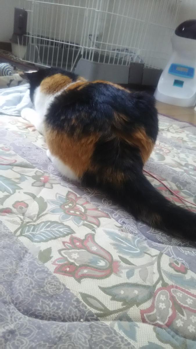 2018年2月、なついていた野良猫を飼う事にしました。 三毛の女の子です。 完全室内飼いしています。外に出たがったりしないので助かります。 抱っこは苦手だけど、添い寝は大好きな娘です。