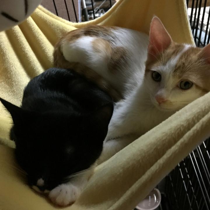 一昨日あたりから朝ケージで寝ころんでる2にゃんを触ると