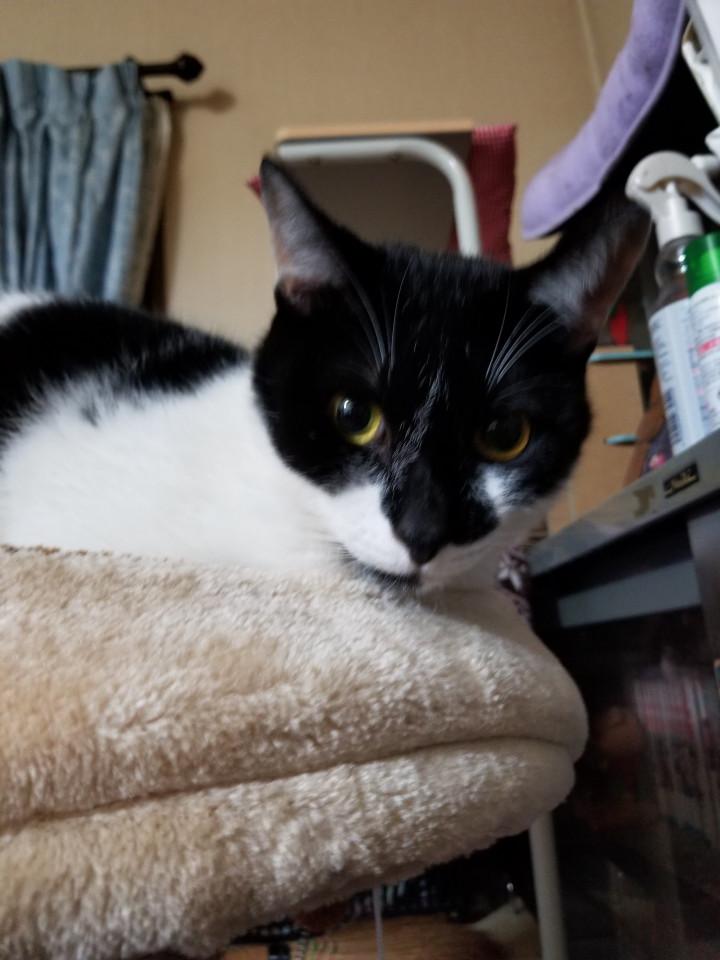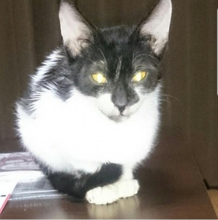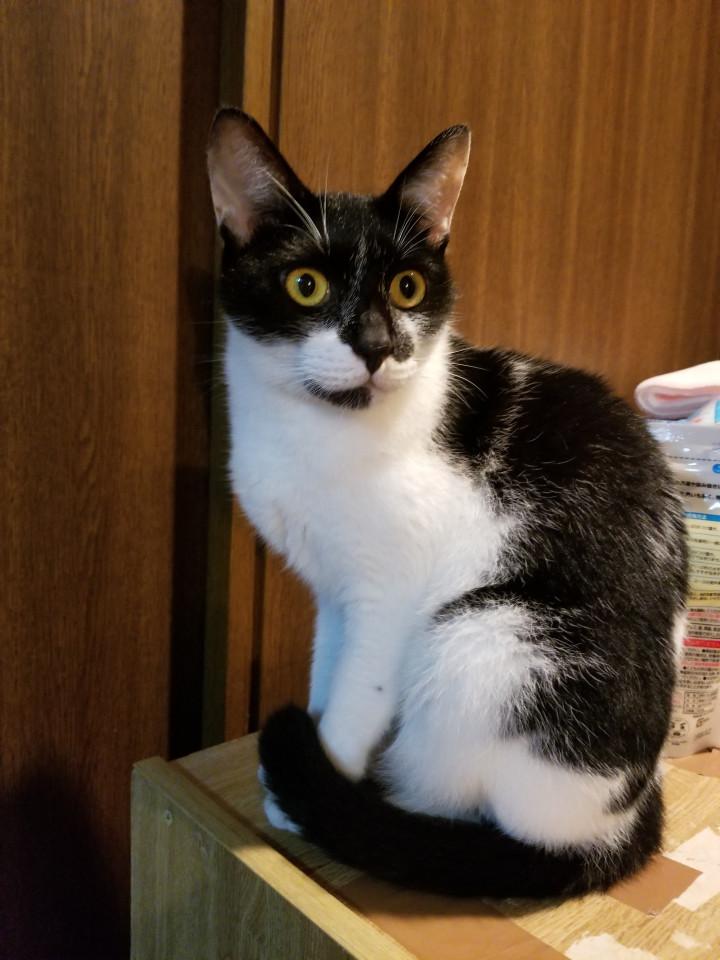 ジ○ティーで生後7ヶ月のアゴの模様が特徴的な白黒猫のおはぎを見つけ、何故か惹かれるように里親になりたい…と思い応募しました❗