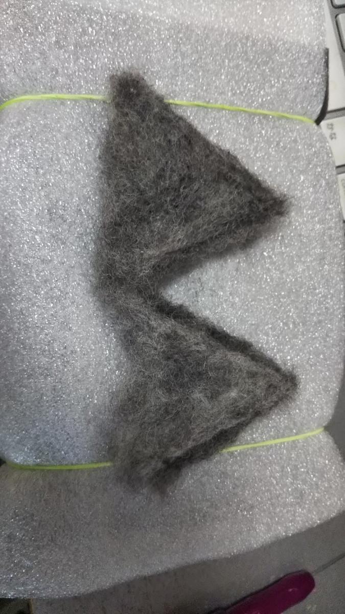 よーくみると、三角の耳を単にくっつけるだけじゃものすごく違和感があったので、いったん作業を止めて、美雨様の耳を四方八方から穴があくほど見て(当然嫌がられたw)気がついたのは、耳の形は前に向かって回り込むようにカーブしてるということ。