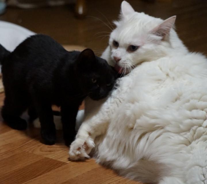 いつもサフィーやプーさんがグルーミングしてくれるお返しに、長毛のサフィーを舐めてあげる