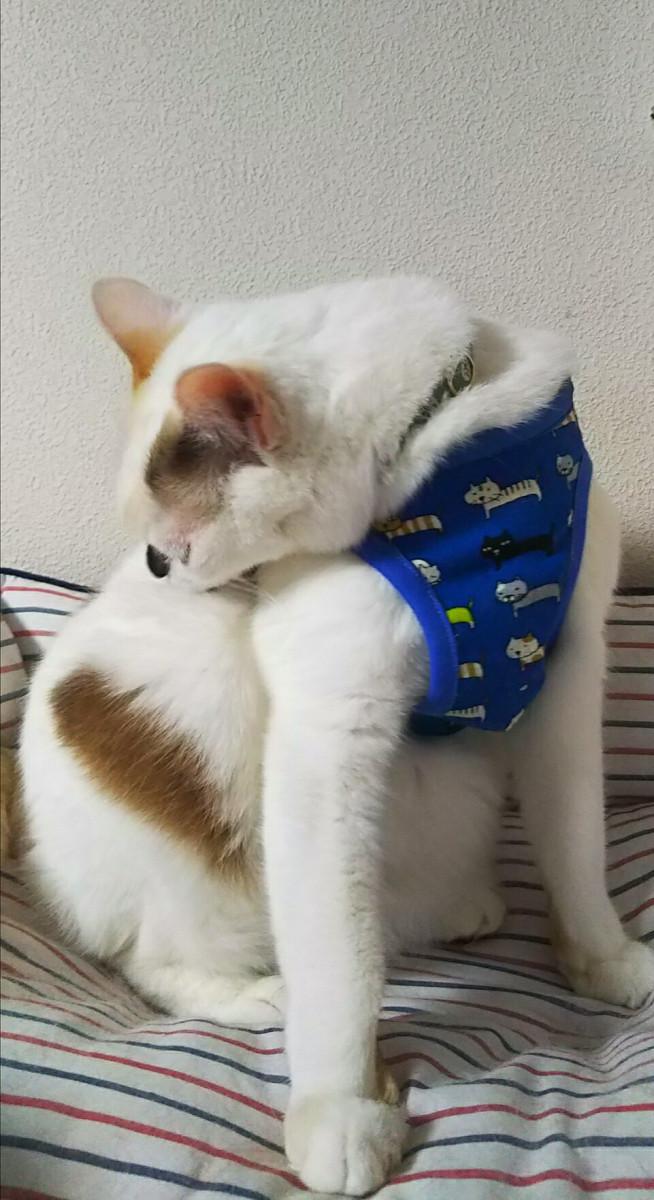 注射されたところが気になって舐めようとするので、みしゃブランドのハーネスを着せてます。