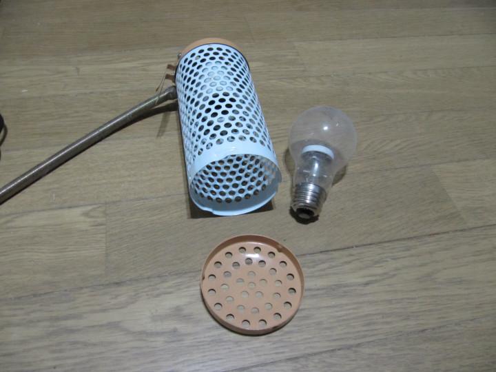 ペット用暖房器具の保温電球をゲージにぶら下げています。
