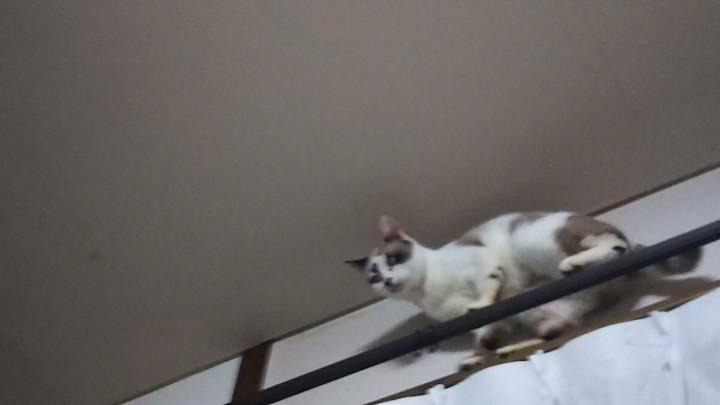 仕方なく、チビッ子こまちを飛び越えて、ケージの隣のキャットタワーを伝って降りました。