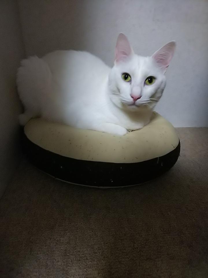 夫がお尻が痛いと言うので1年位前にドーナツ型のクッションを買ったのですが、使わないのでちーちゃんのものになりました。