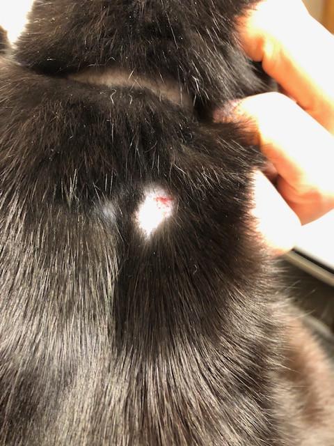 キキのおハゲ。少し広がり一部傷になってしまいました。痒がってもいないので内服薬のみで様子を見ています。毛が生えてくるまでに長くかかりそうですわ。