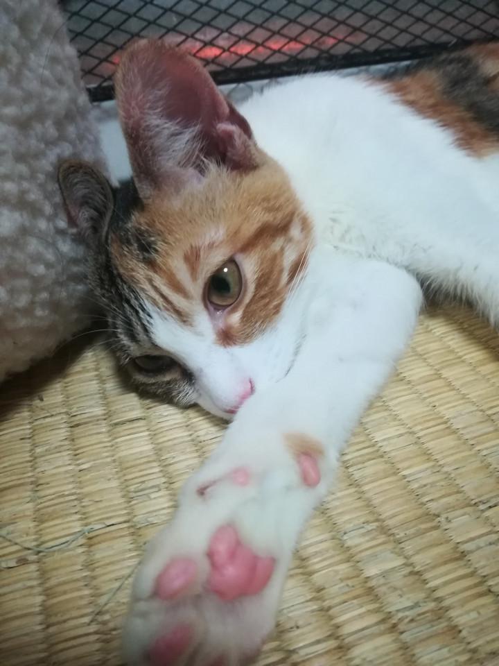 家に着いてキャリーから出たきなこはちょっとおどおどしてましたが、すぐに水を飲んでトイレでオシッコしてヒーターの前でまったりしました。