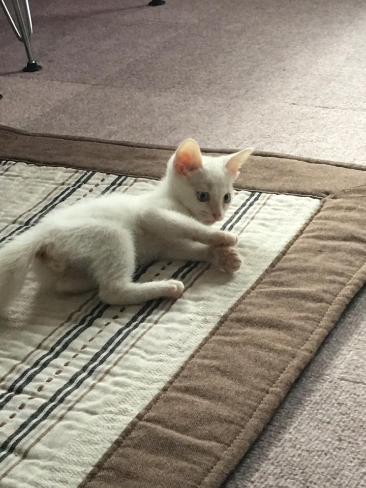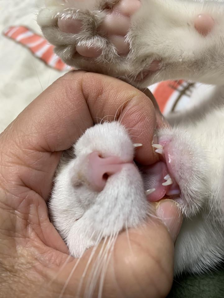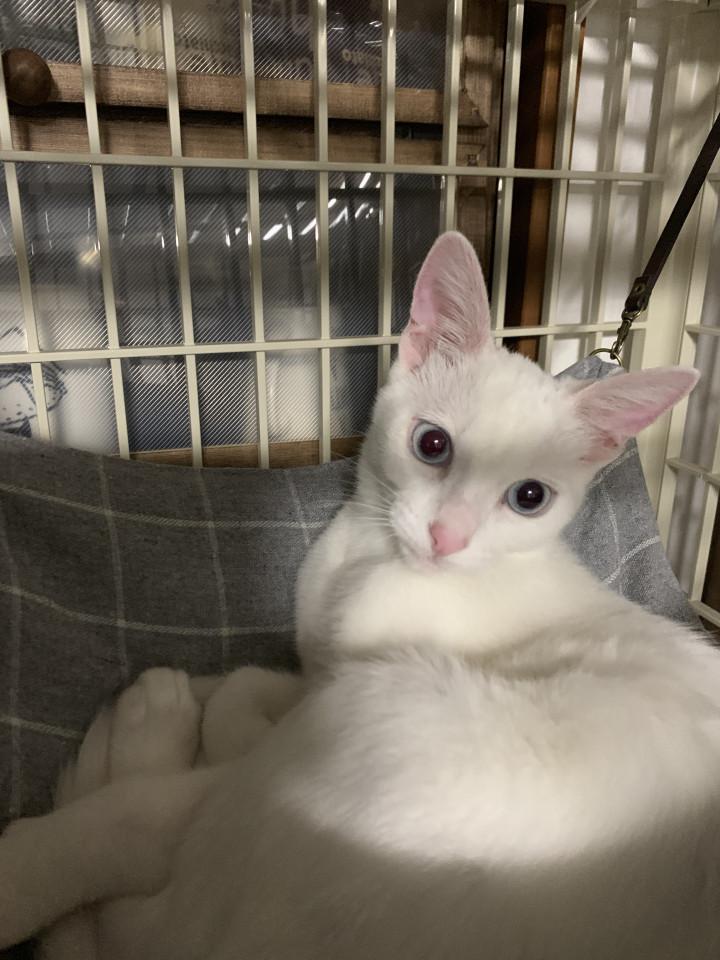 去年の10月5日、5匹保健所に保護され、ウチで一時預かりとなりました。キジ猫の兄弟と、白猫と黒猫の兄弟と、背中に傷を負ったキジ子ちゃん。みんな700g〜1000gだったのですが、白猫ちゃんは体重が580g、一緒に保護された黒猫のお兄ちゃんは960gだったので、ずいぶん体格差があるなーと、思いながらお世話をしていました。そして、その白猫はウチの子にになりました。