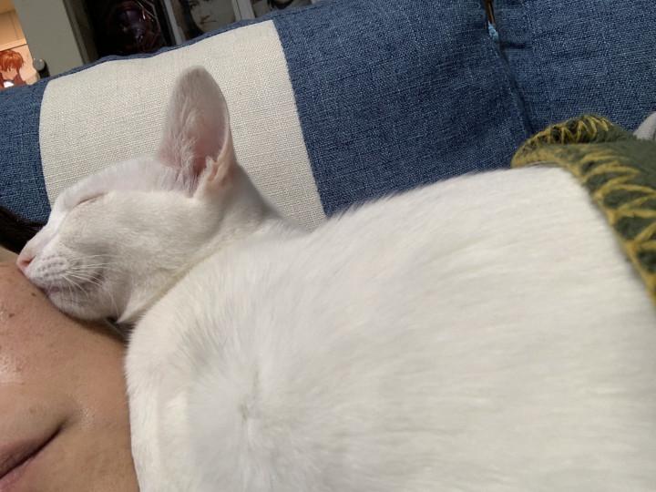 こうやって顔の上で寝られると、寝返り打てなくて(笑)