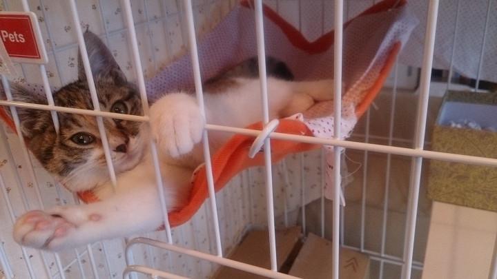 最初の1週間はケージの上の段にジャンプ出来なかったのですが、上れるようになって居心地の良いハンモックを発見。以来お気に入りの寝床になっています。