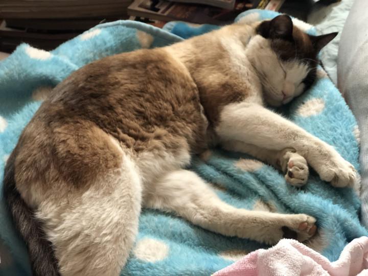 火曜日、落ち着きを取り戻した白が朝パトから戻って部屋で爆睡。