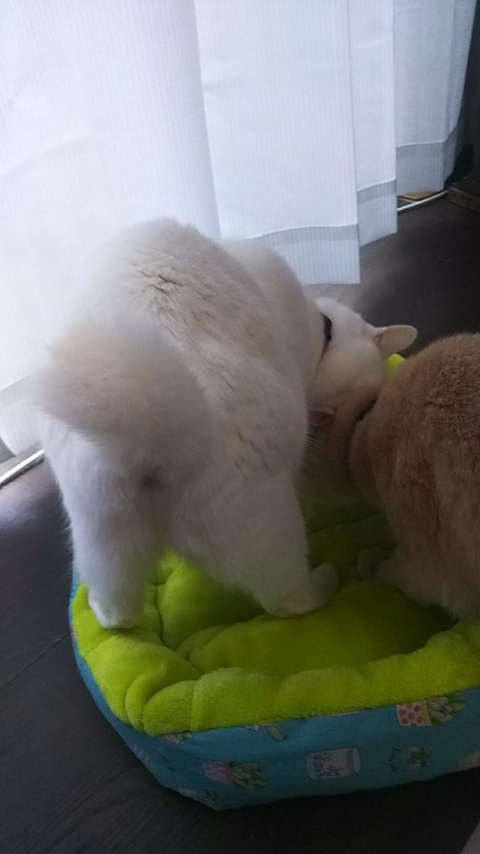 前に作ったベッドは数ヶ月間使い続けてすっかり汚れてしまったので、洗い替えを作ったのですが、ちょっと置いておいたらフィービィーが、、、