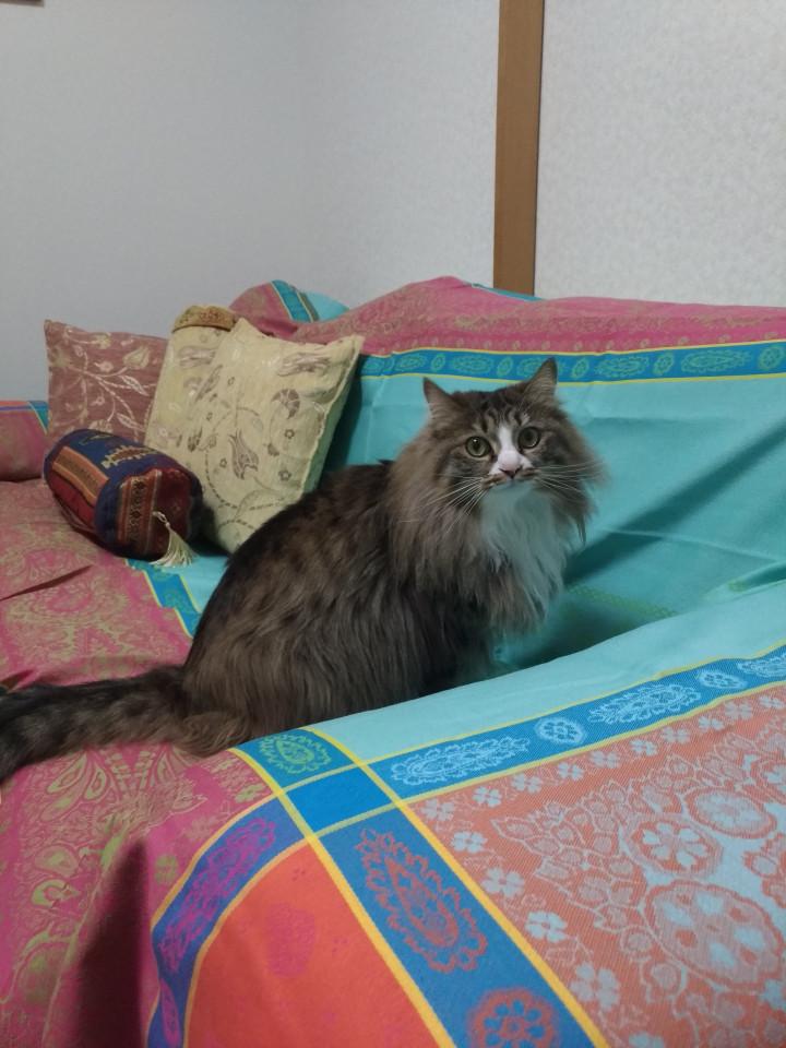 衝動買いしたテーブルクロスをソファにセットしようとすると、、、