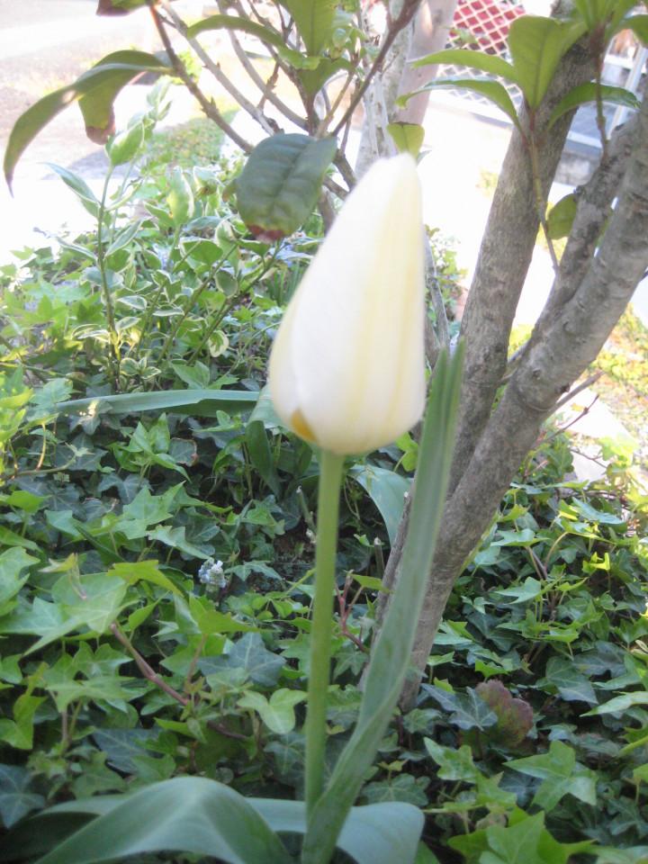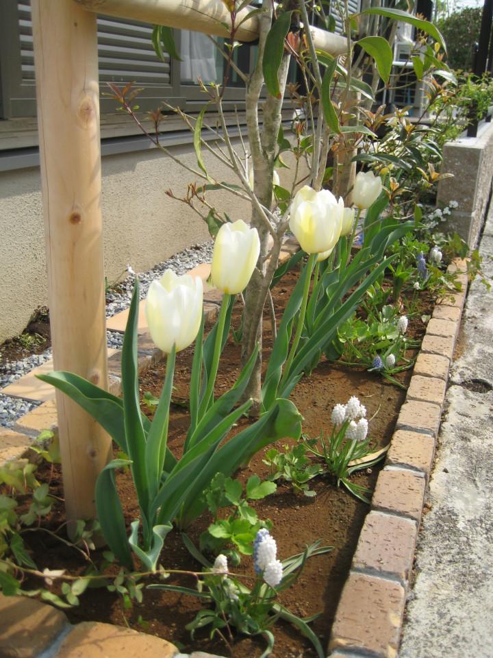 去年、引っ越して初めて植えた白チューリップ+ムスカリですが