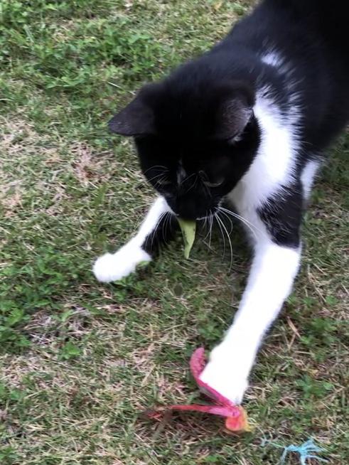 葉っぱを咥えながら遊ぶのらこ