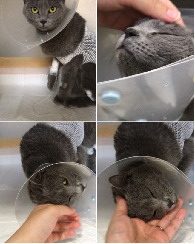 とあって、撫でられてるときグイグイ頭を押しつけてくるんですよ〜めちゃくちゃ可愛い。カラーのせいで思うようにいかないな〜と言ってました(T_T)