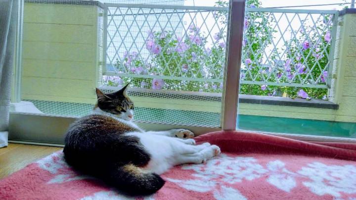お気に入りの毛布の上で満開のムクゲの鑑賞♪ 気温的にはちょうど良いのか?庭のムクゲ 狂ったように咲いてます^^;