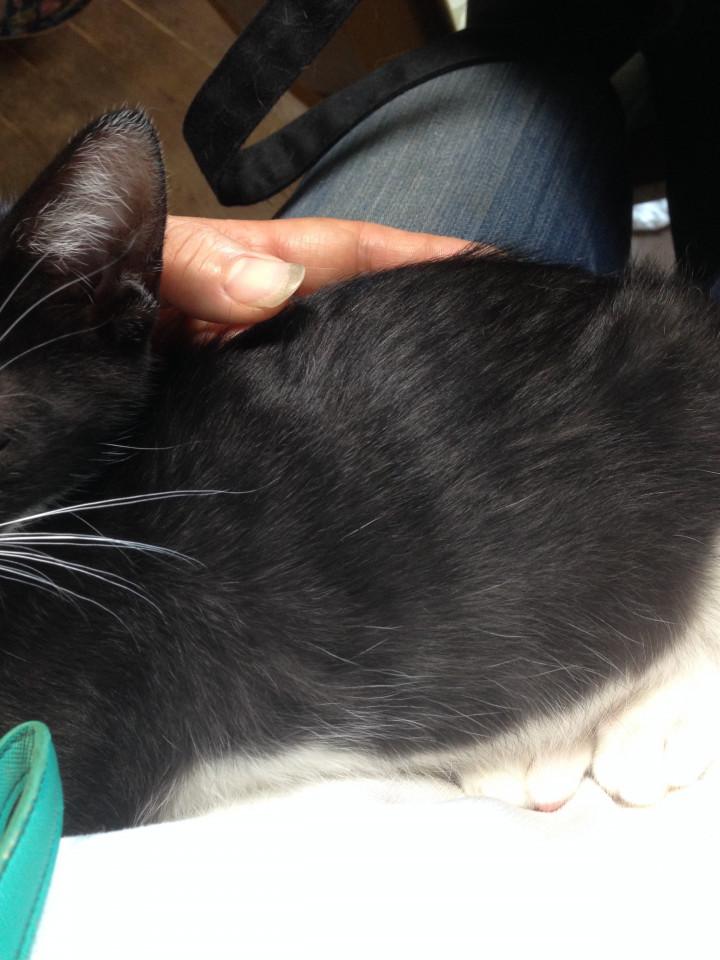 サスケ、単に黒白だと思って居たのですが、黒い毛にうっすら縞模様が出て来て、スモーキーブラックの様な状態になって来てます。