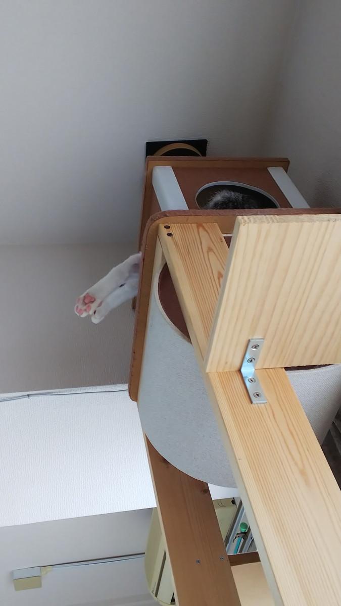 猫ちゃんタワーの一番上のスペースでほぼ1日お昼寝中