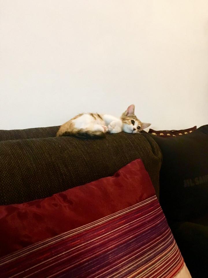 少しお部屋に、、、と2日間の約束を早速守れずリリースすると、、、、走る、走る!!、、、追いかけっこが始まり大忙し。部屋中にニャアくんの匂いがあり、安心なのか、ソファーで寛いだり、すっかりリラックスモード。