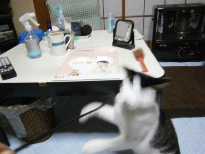 ミッキーの手の平の形をしたじゃらし(?)で遊んでいて、見事にしおみちゃんの顔面を捉えたペシペシショットです(笑)