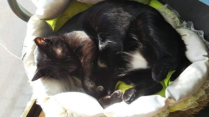 リビングにある猫ベッドに寝ていた。(多分寝室のエアコンの風が寒かったのだろう)