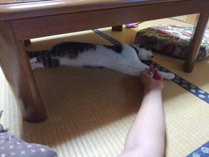 そして、チビの肉球が肌色なのを知り、触りたがる旦那。