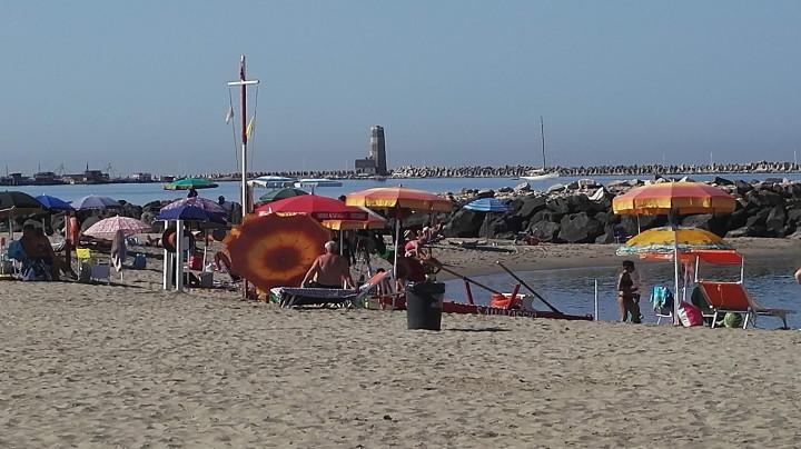 持参の色とりどりのものや、ショップで借りたオレンジ系パラソルが並ぶ、無料ビーチ…