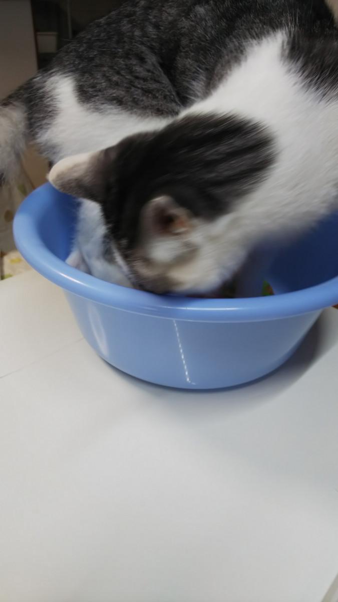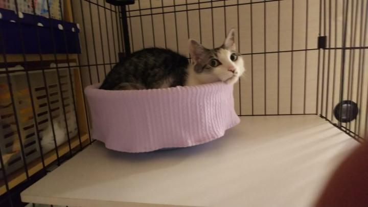 お気に入りの洗面器ベッドもひんやりするようで、落ち着きがありません😅