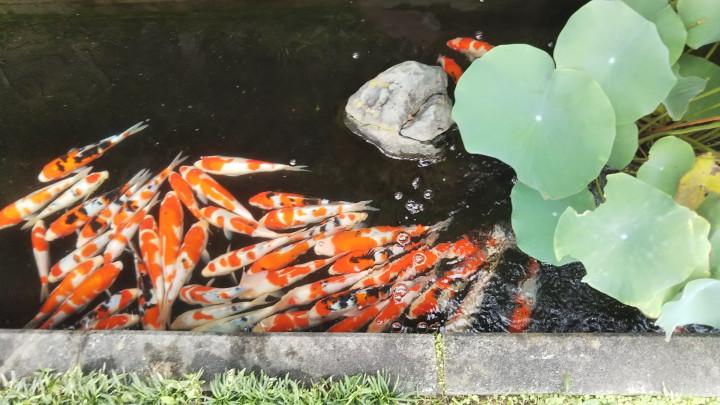水路の一角になぜか集団で固まってた錦鯉たち。