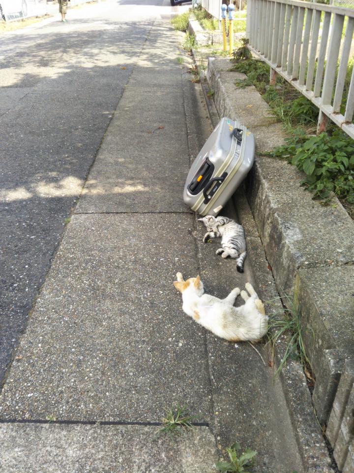 保護の前に暑い中、涼しいところを求めて路上で先輩猫とお昼寝
