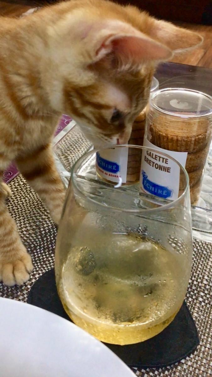 お行儀悪くテーブルの上、ダメですよ〜〜!!、、と、どうやら氷のプカプカがとっても気になる様子。
