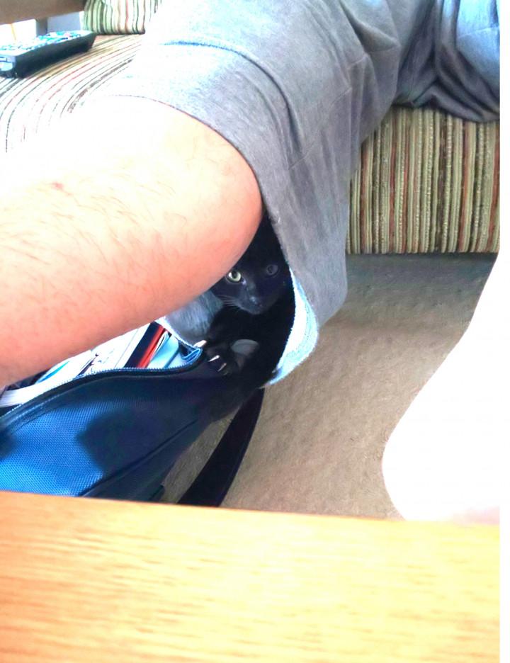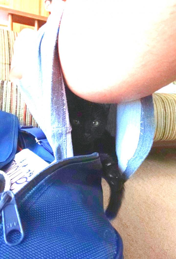 ふと見るとズボンの裾に入ってくつろいでる姿が…。