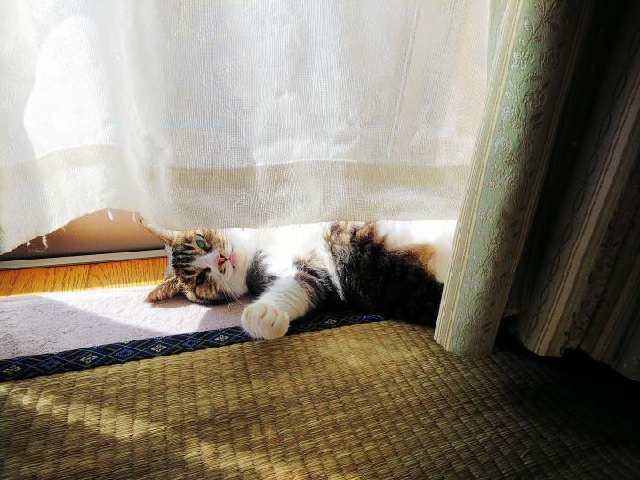 午前中はリビングの窓辺で日光浴。私が近づくと固まり不細工顔に😭↓