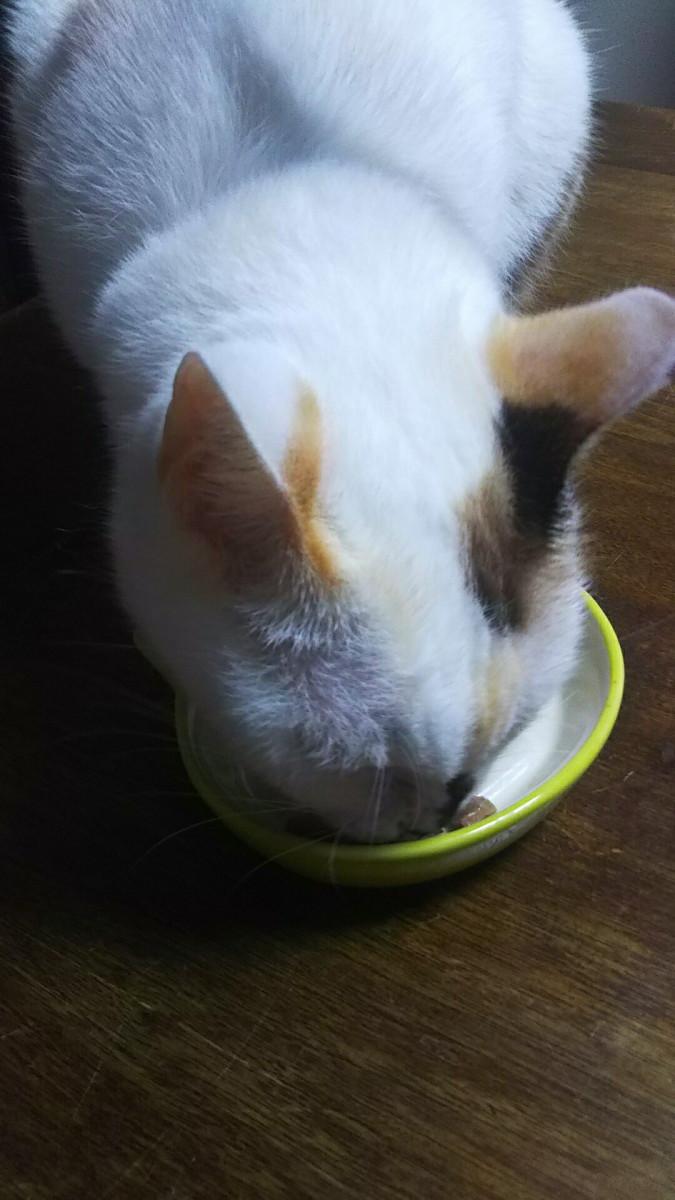 いちが療法食を食べていると、正面に座っていちの食事が終わるのを待ってます。