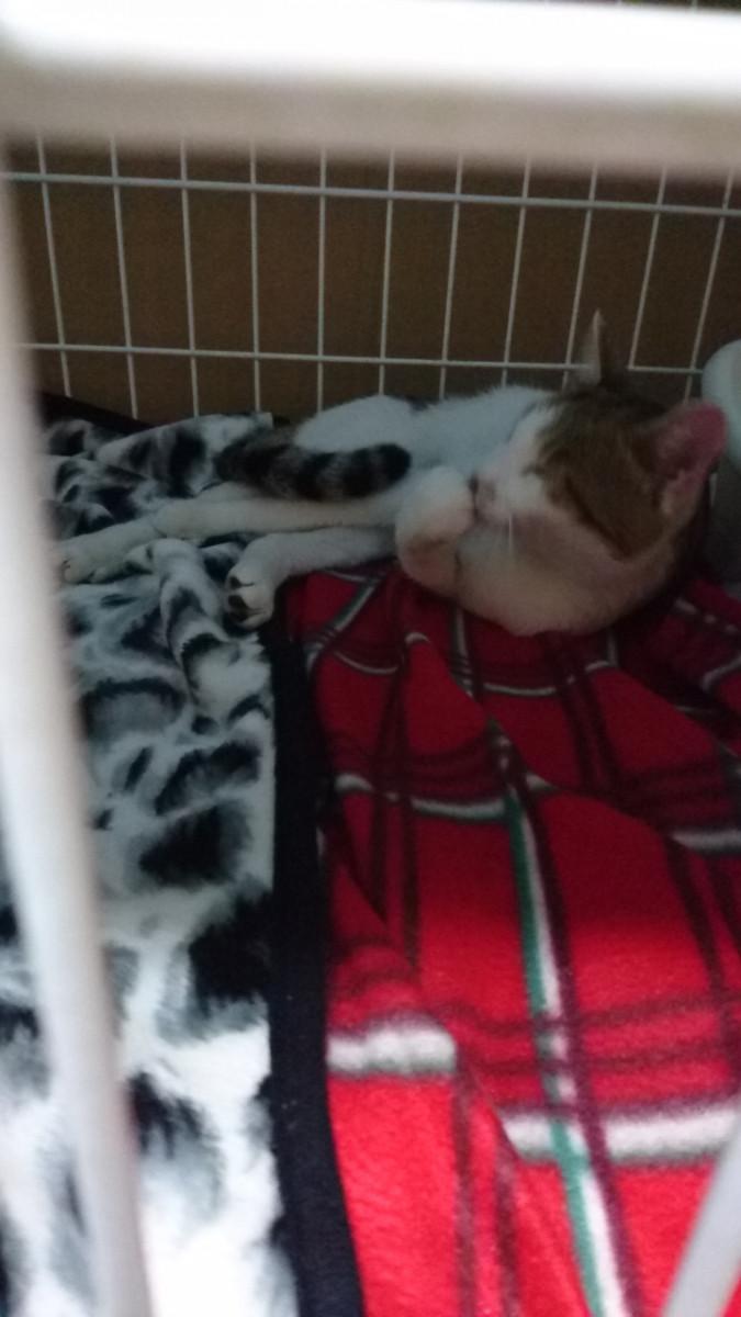 家に連れて来てゲージに入れたら、すぐにおとなしくなって、ゴロっとなって、くつろぎ過ぎなくらい、寛いでます(笑)