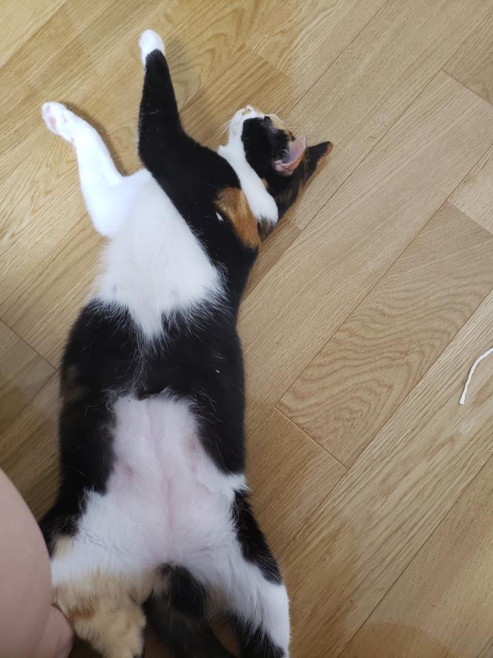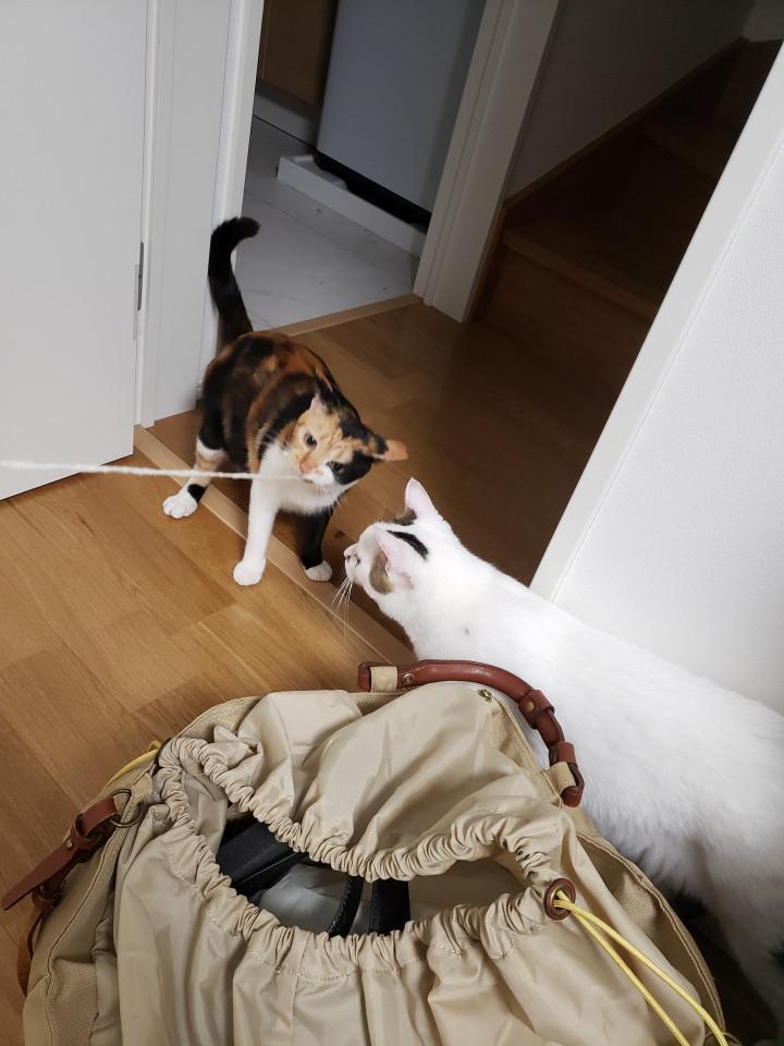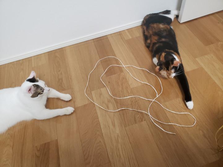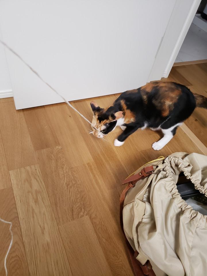 資源ごみを片付けているときに使っていた紙紐をじゃらしに使ったところ、とても気に入り30分くらい全力でじゃれています。