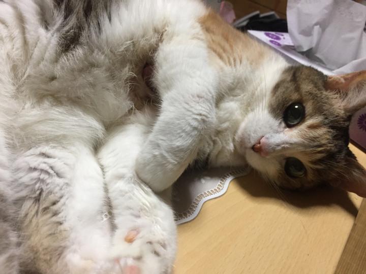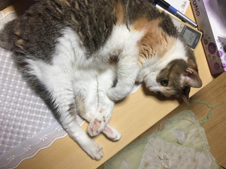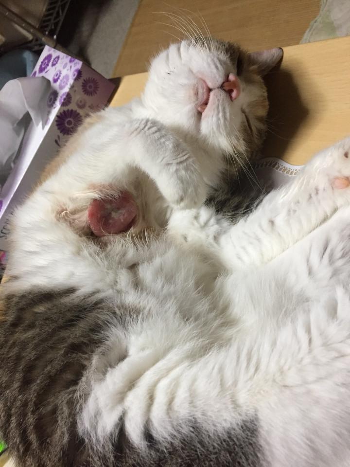 まおちんのテーブル写真を本日は…テーブルでコロリンちょしても全く怒らない私。(笑)これは1年前の夏の写真です。腫瘍が痛々しいけど本ニャンは爆睡している姿です🙀