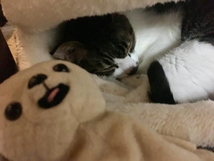モカはそこで、ニャアちゃんのクッションに頭を乗せ、寄り添う様に寝ていました。