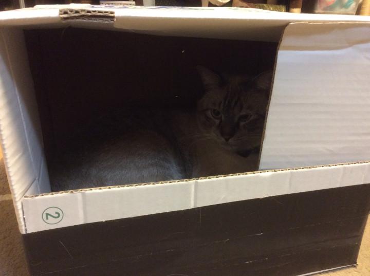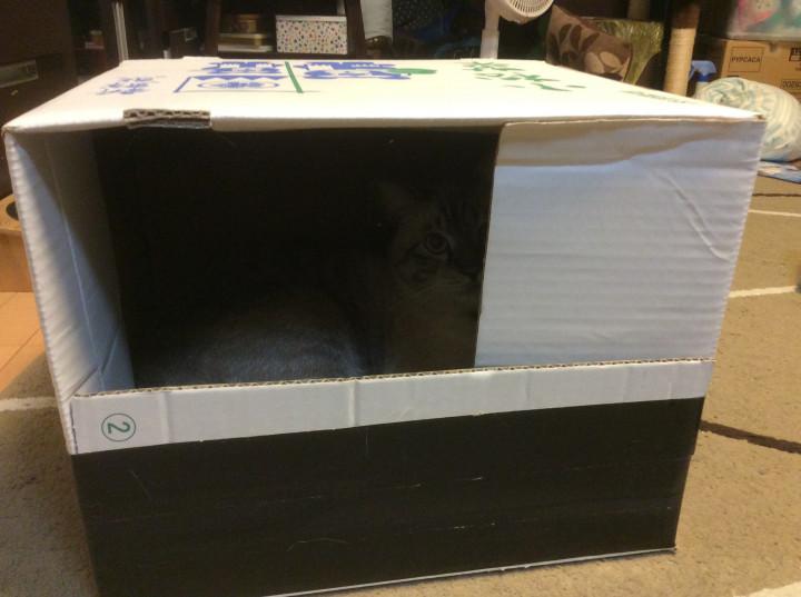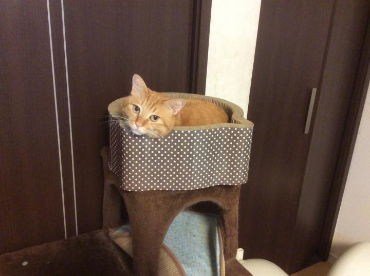 キャットタワーは、上部が少々グラグラしてきので、いっそ外して猫さん用段ボールベットを置いたら、茶々のお気に入りに。